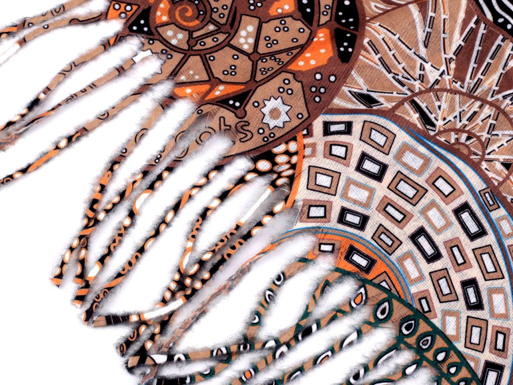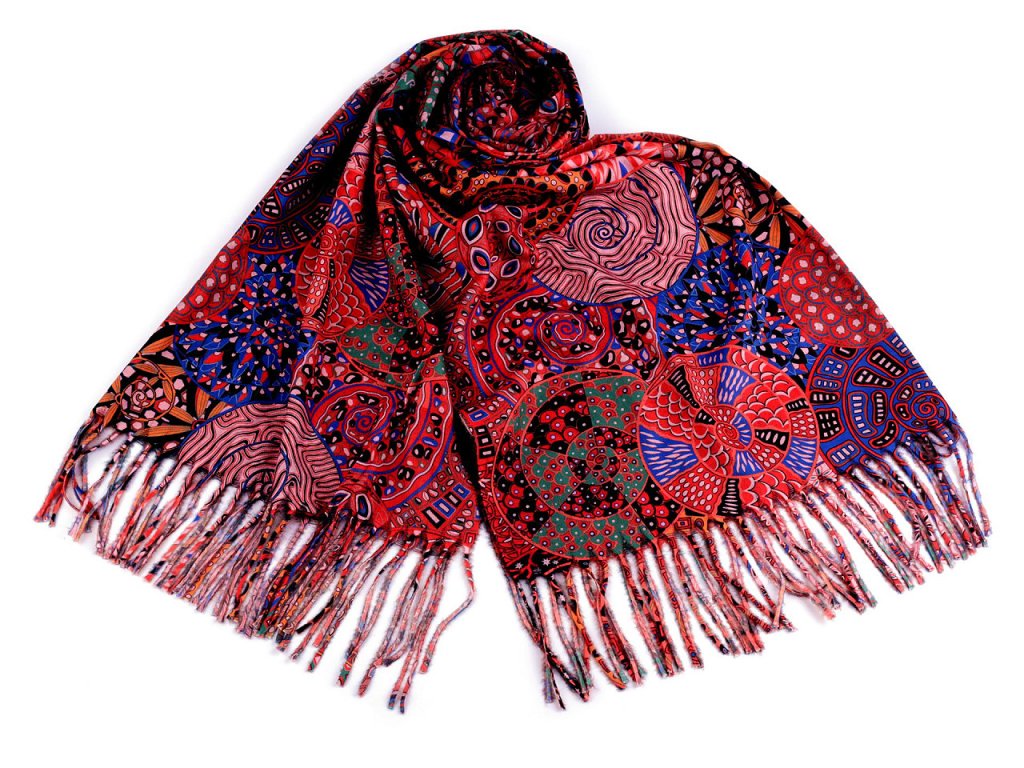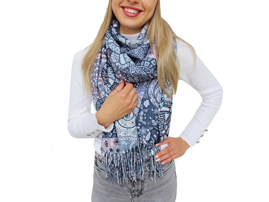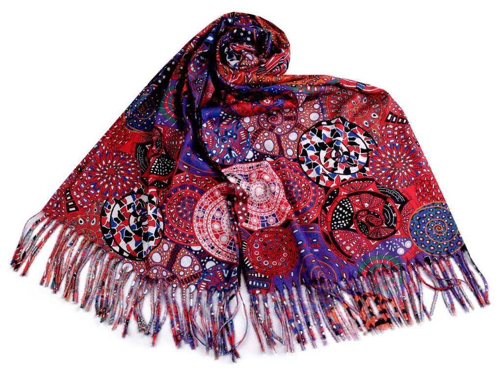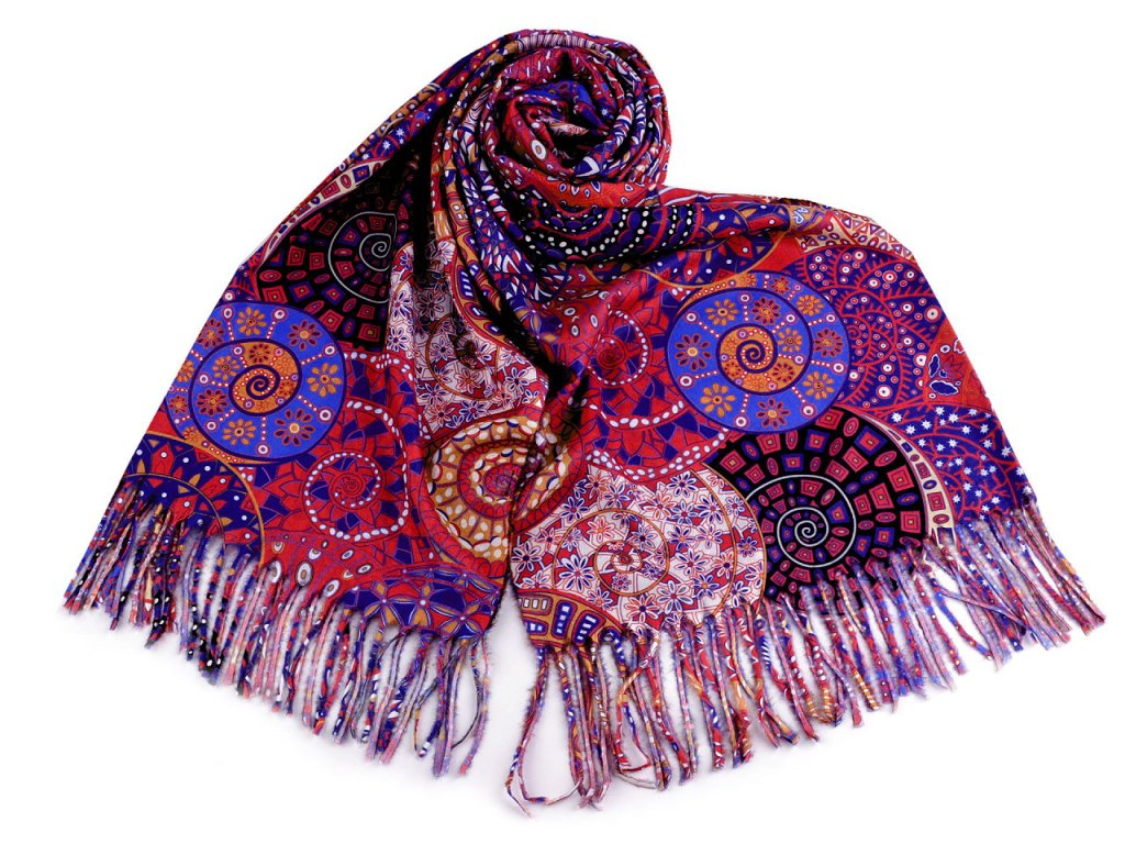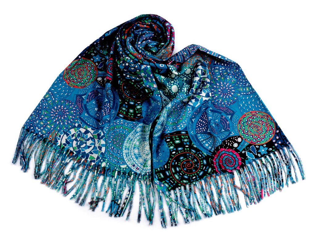 Velká šála typu kašmír je vyrobená z hřejivého materiálu, který je příjemně hebký na dotek. Je ozdobená poutavými obrázky překrývajících se barevných spirál. Krásně vás zahřeje v chladném a sychravém počasí. Na koncích je zakončená střapci.