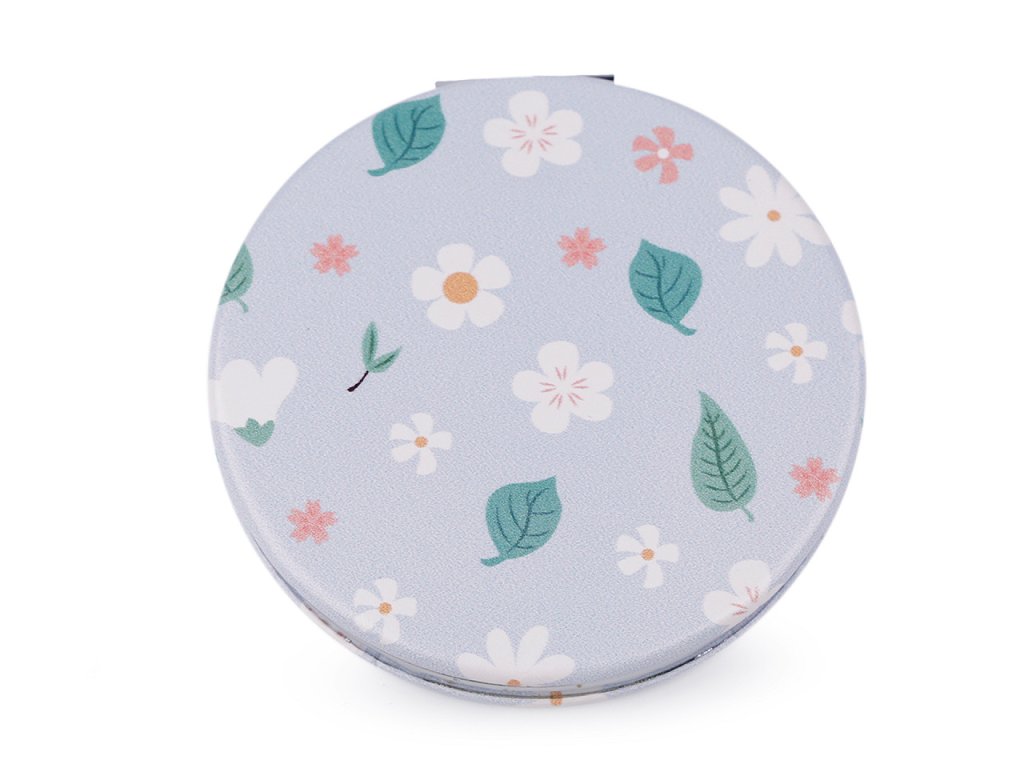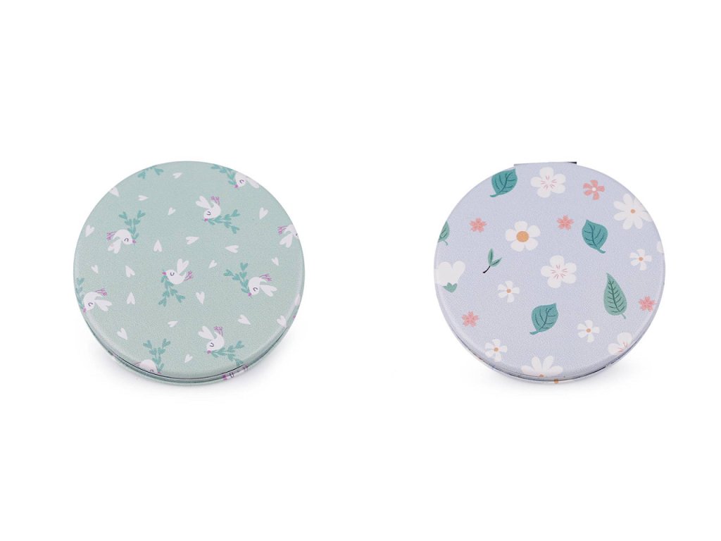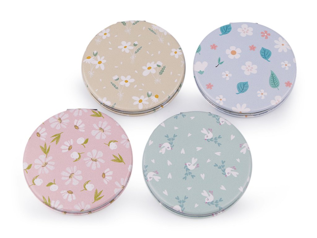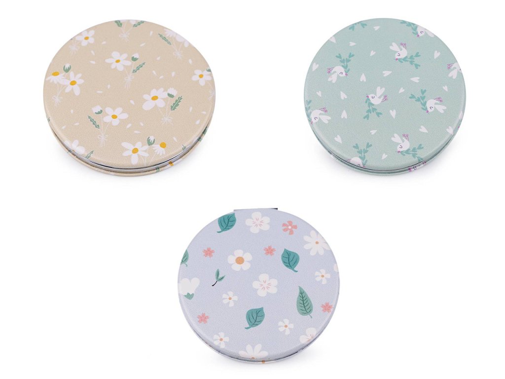Má kvalitní zpracování z eko kůže s dekorem květů nebo ptáčků. Potisk je na horní i dolní straně. Uvnitř jsou 2 zrcátka, jedno je zvětšovací.