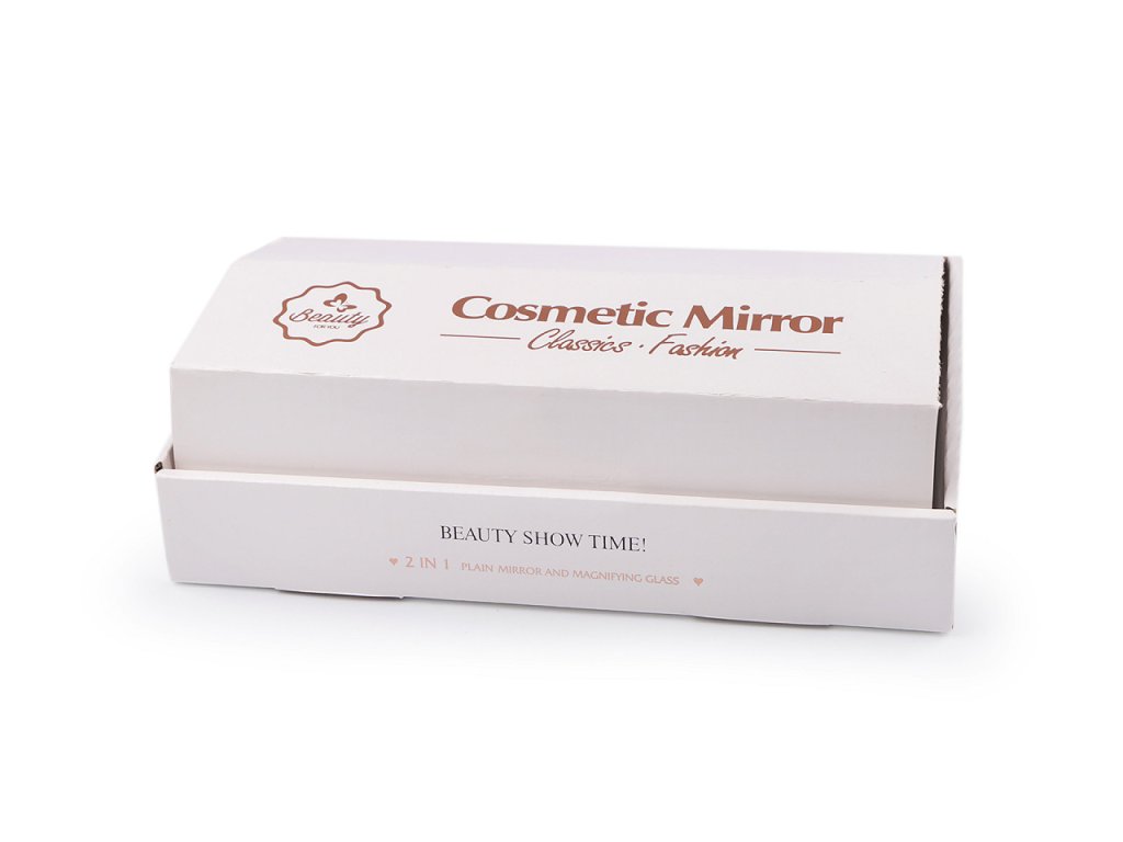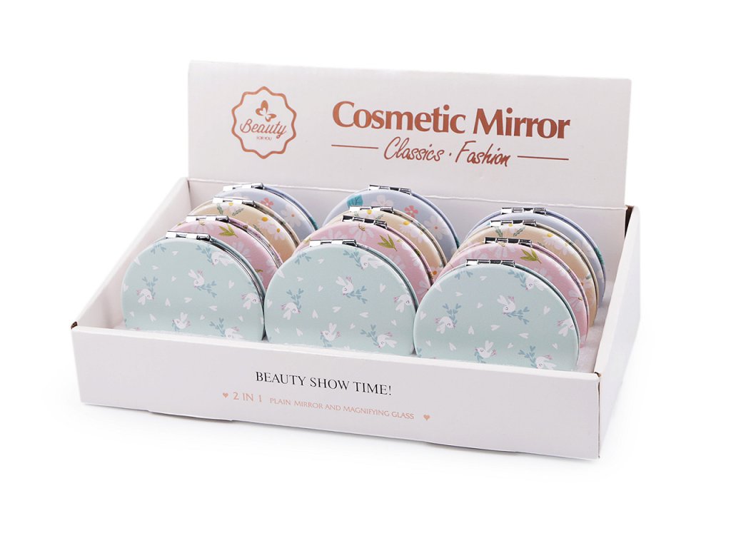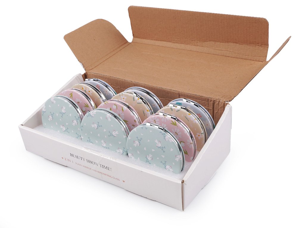 Zrcátka v balení mix 12 ks jsou zabalená v papírové krabici. Uvnitř má stojánek, hodí se k vystavení do prodejny, viz foto. Krabice má rozměry 13 x 24 x 8 cm.