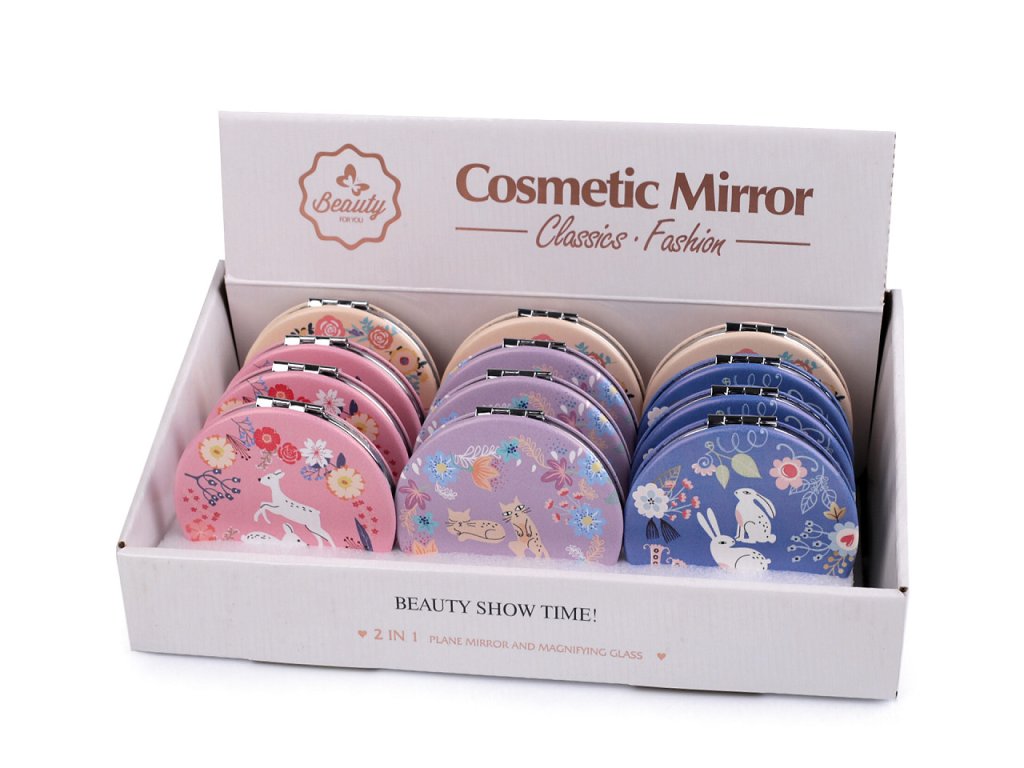 Zrcátka v balení mix 12 ks jsou zabalená v papírové krabici. Uvnitř má stojánek, hodí se k vystavení do prodejny, viz foto. Krabice má rozměry 13 x 24 x 8 cm.